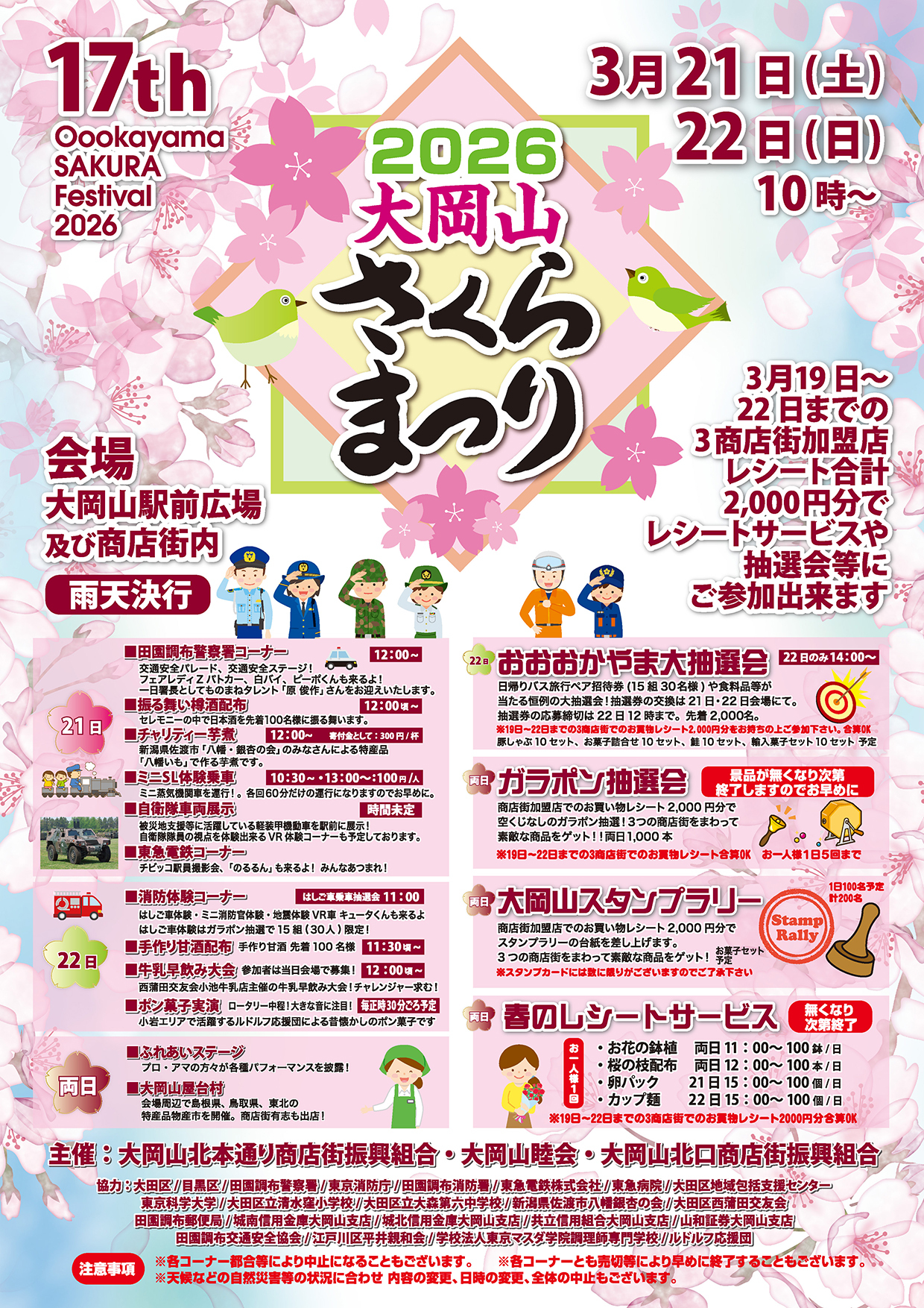 3月19日~22日までの3商店街加盟店レシート合計2,000円分でレシートサービスや抽選会等に参加できます。 21日 ■田園調布警察署コーナー 12:00~ 交通安全パレード、交通安全ステージ フェアレディZパトカー、白バイ、ピーポくん 一日署長としてものまねタレント「原 俊作」さんをお迎えいたします。 ■振舞い樽酒配布12:00頃~ セレモニーの中で日本酒を先着100名様にふるまいます。 ■チャリティー芋煮12:00~ 寄付金として一杯300円 新潟県佐渡市「八幡・銀杏の会」のみなさんによる特産品 「八幡いも」で作る芋煮です。 ■ミニSL体験乗車10:30~・13:00~、100円 ミニ蒸気機関車を運行 各回60分だけ運行になります。 ■自衛隊車両展示 被災地支援等に活躍している軽装甲機を駅前に展示 自衛隊員の視点を体験できるVR体験コーナーも予定しています。 ■東急電鉄コーナー チビッコ駅員撮影会「のるるん」も来るよ。 22日 おおおかやま大抽選会 22日のみ14:00~ 日帰りバス旅行ペア招待券(15組30名様)や食料品等が当たる恒例の大抽選会 抽選券の交換は21日・22日会場にて 抽選券の応募締切は22日12時まで 先着2,000名 ※19日~22日までの3商店街でのお買物レシート2,000円分をお持ちの上ご参加ください。合算OK 豚しゃぶ10セット、お菓子詰合わせ10セット、鮭10セット、輸入菓子セット10セット、予定 はしご車乗車抽選会 11:00 はしご車体験・ミニ消防官体験・消防車試乗 キュータくんも来るかも? はしご車体験はガラポン抽選で15組(30人)限定 ■手作り甘酒配布 11:30頃 手作り甘酒先着100名様 ■牛乳早飲み大会 12:00頃 西蒲田校友会小池牛乳店主催の牛乳早飲み大会 チャレンジャー求む! ■ポン菓子実演 毎正時30頃予定 ロータリー中ほど「大きな音に注目! 小岩エリアで活躍するルドルフ応援団による昔懐かしのポン菓子です。 両日 ■ふれあいステージ プロ・アマの方々が各種パフォーマンスを披露 ■大岡山屋台村 会場周辺で島根県、鳥取県、東北の特産物産市を開催。商店街有志も出店 ガラポン抽選会 商店街加盟店でのお買物レシート2,000円分で空くじなしのガラポン抽選3つの商店街をまわって素敵な商品ゲット 両日1,000本 お一人様5回まで 大岡山スタンプラリー 1日100名予定計200名 商店街加盟店でのお買物レシート2,000円分でスタンプラリーの台紙を差し上げます。3つの商店街をまわって素敵な商品をゲット ※スタンプカードには数に限りがございますのでご了承ください。春のレシートサービス・お花の鉢植 両日11:00~100本 ・桜の枝配布 両日12:00~100本 ・卵パック 21日15:00~100個 ・カップ麵 22日15:00~100個 お一人様1回です 今年も楽しい出し物が盛りだくさんです。たくさんの方のご参加お待ちしております。みなさま、遊びに来てください。